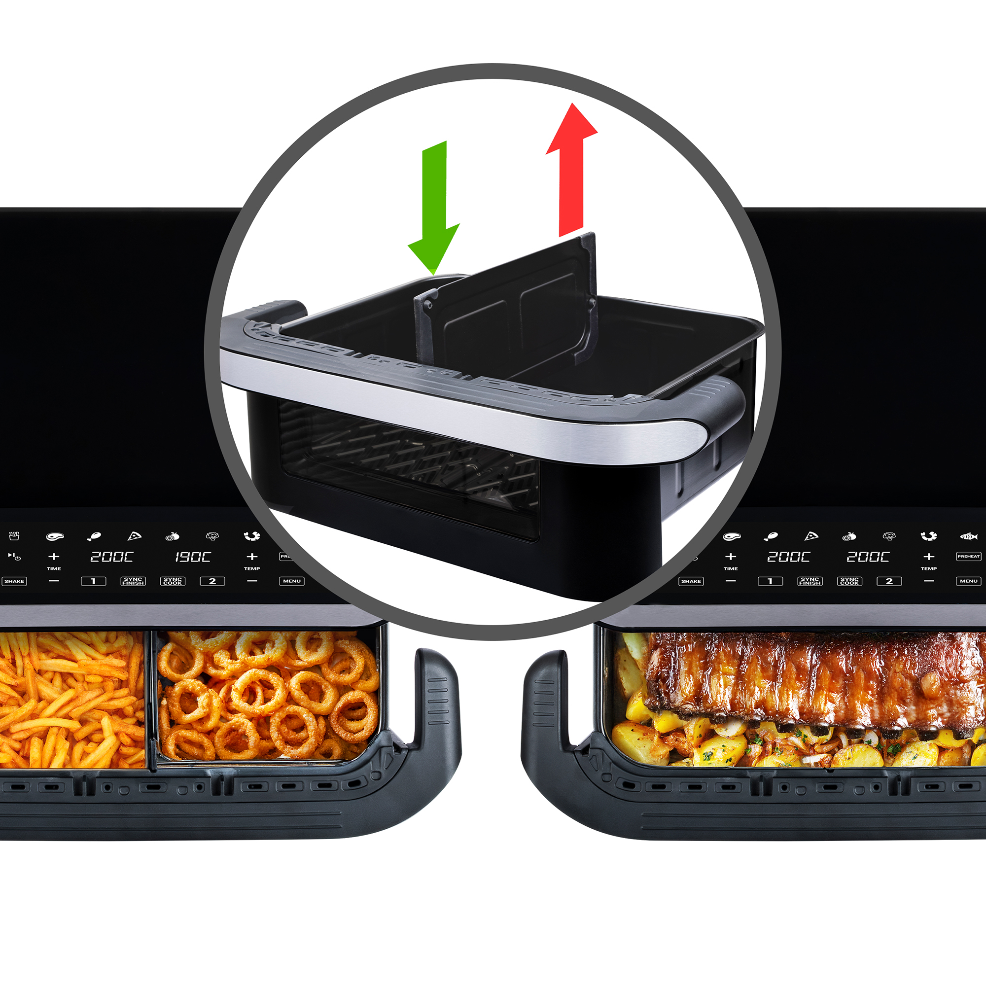 A főzési igények maximális kielégítése érdekében egy tágas, 10 literes kosár található benne, amely egy kivehető válaszfal segítségével két különálló, 5 literes részre osztható. Ez azt jelenti, hogy könnyedén készíthetsz nagyobb mennyiségű ételt az egész családnak, vagy csupán két különböző ételt is süthetsz egyszerre anélkül, hogy az ízek összekeverednének. A megvilágított betekintőablak lehetővé teszi a főzési folyamat kényelmes nyomon követését anélkül, hogy ki kellene nyitnod a fritőzt.