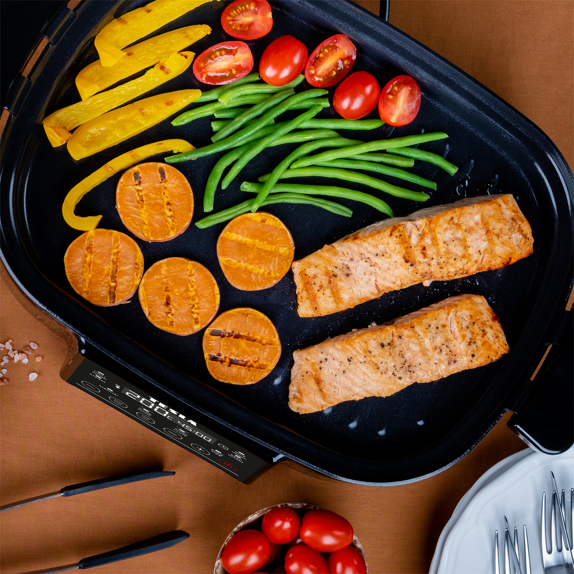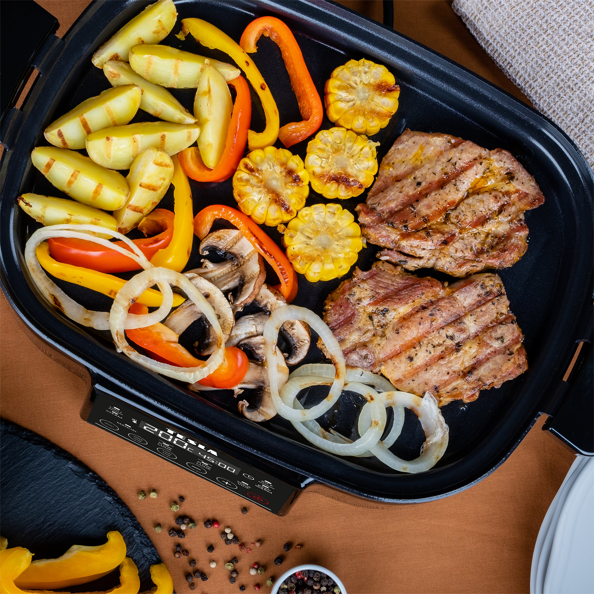 A TESLA MultiCook M90 Grill multifunkciós elektromos tűzhely három különböző módon tesz lehetővé főzést a grillserpenyőnek vagy a főző- és gőzölőedénynek köszönhetően. A rengeteg lehetőség közül választva készíthetsz tojást és szalonnát reggelire vagy palacsintát, steaket egy randevúra, vagy tésztát az egész családnak.